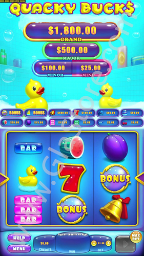 - 3 DUCK SYMBOLS on the payline award a RESPIN BONUS feature. Each time an extra DUCK appears on the reels, you get an extra spin. Collect 9 DUCKS to win the GRAND PROGRESSIVE JACKPOT